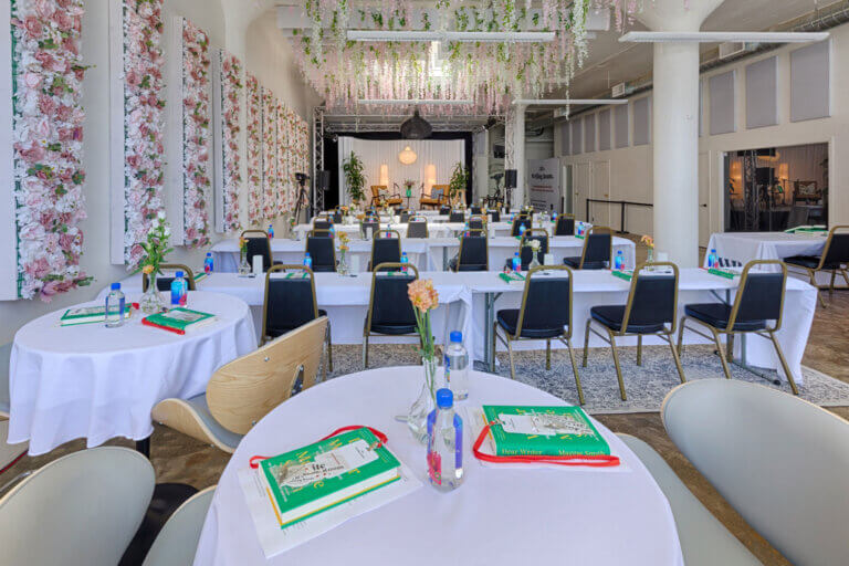 A 2,500 sq ft industrial-modern event space perfect for company offsites, live podcast recordings, book events, and creative meetups.